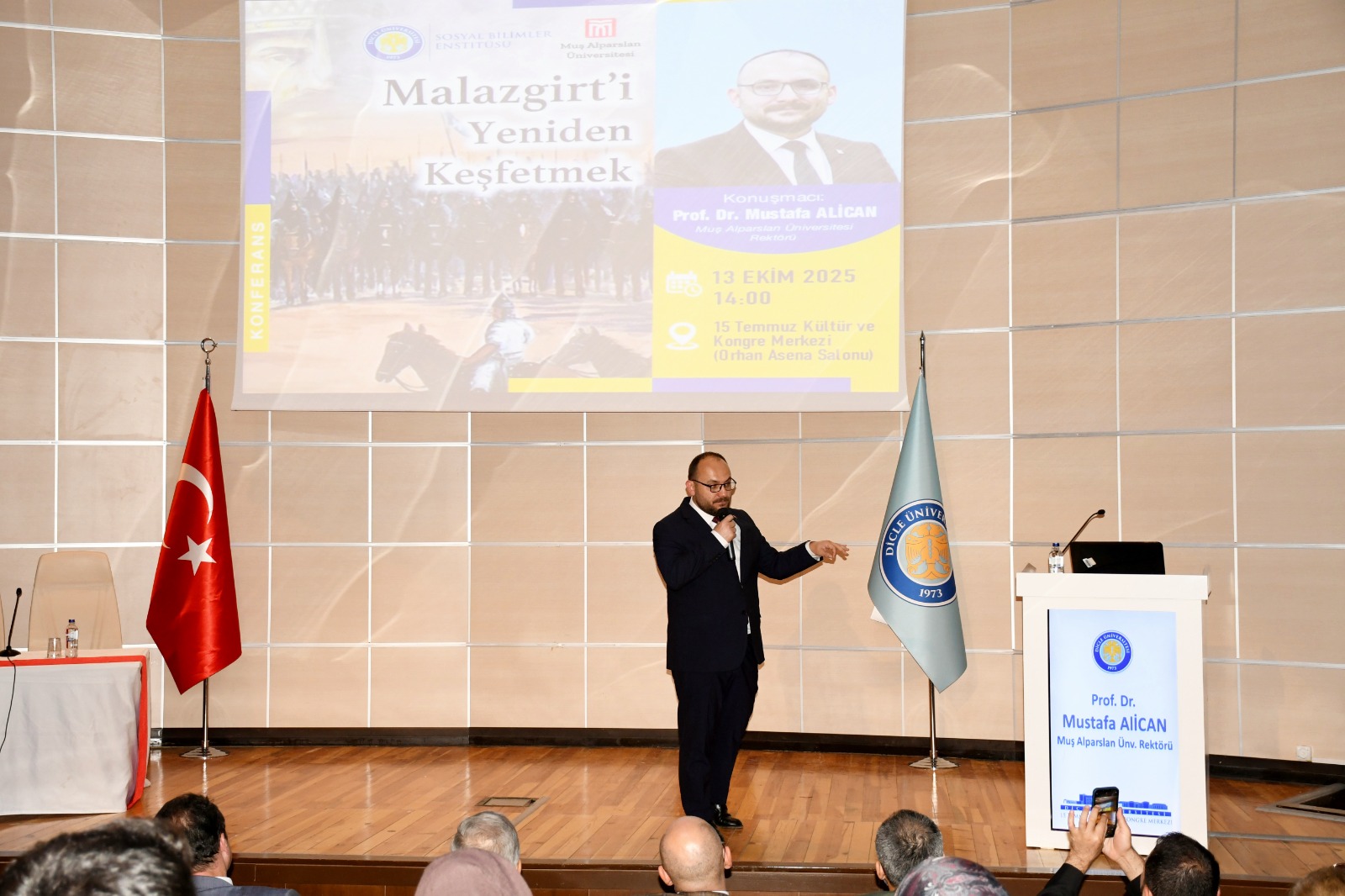 Dicle Üniversitesi Sosyal Bilimler Enstitüsü tarafından 15 Temmuz Kültür ve Kongre Merkezinde düzenlenen “Malazgirt’i Yeniden Keşfetmek”başlıklı konferansta, Rektörümüz Prof. Dr. Mustafa Alican, Malazgirt Zaferi’nin Türk ve dünya tarihi açısından taşıdığı stratejik ve kültürel öneme dikkat çekti.