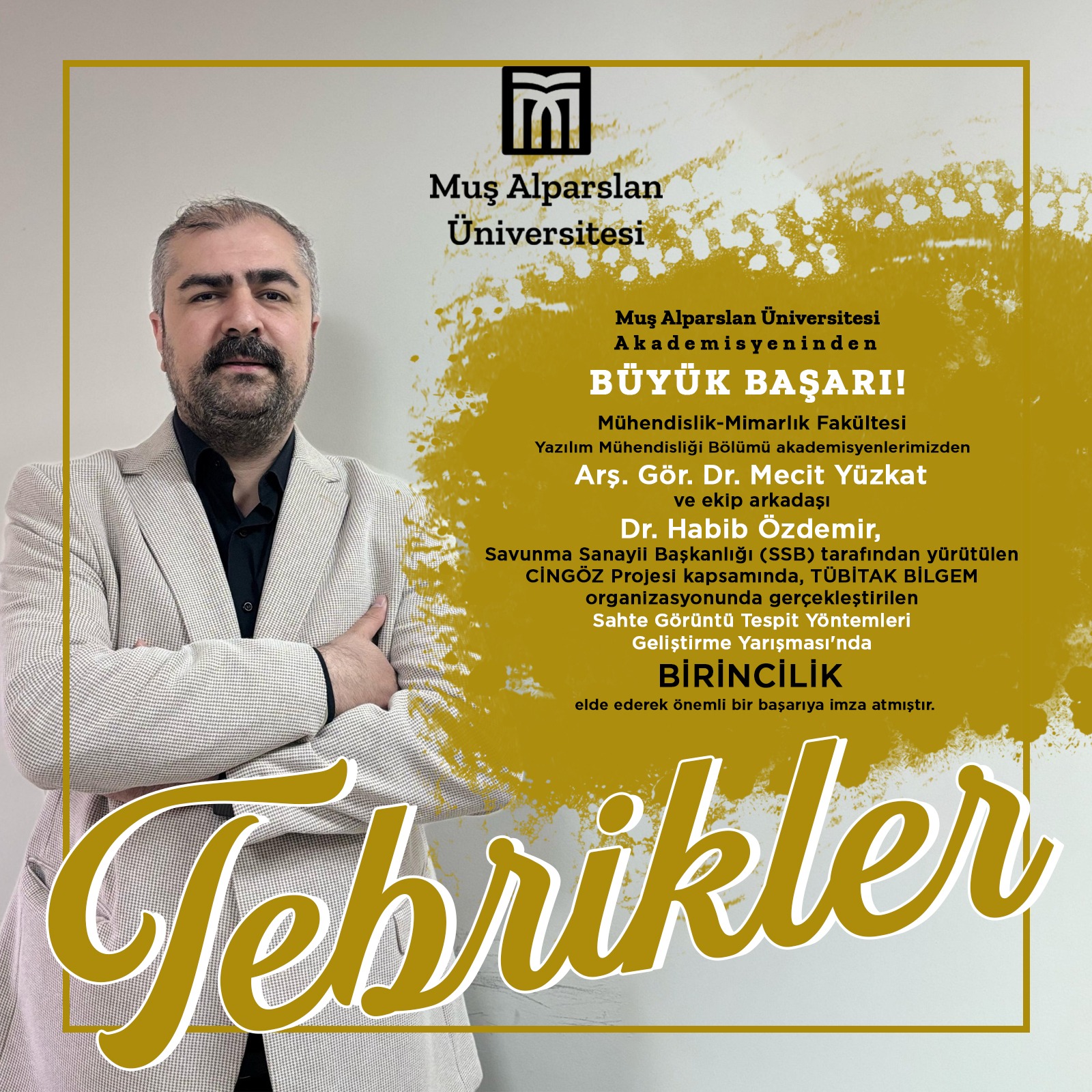 Muş Alparslan Üniversitesi Mühendislik-Mimarlık Fakültesi Yazılım Mühendisliği Bölümü akademisyenlerimizden Arş. Gör. Dr. Mecit Yüzkat ve ekip arkadaşı Dr. Habib Özdemir, Savunma Sanayii Başkanlığı (SSB) tarafından yürütülen CİNGÖZ Projesi kapsamında, TÜBİTAK BİLGEM organizasyonunda gerçekleştirilen Sahte Görüntü Tespit Yöntemleri Geliştirme Yarışması'nda birincilik elde ederek önemli bir başarıya imza attı.