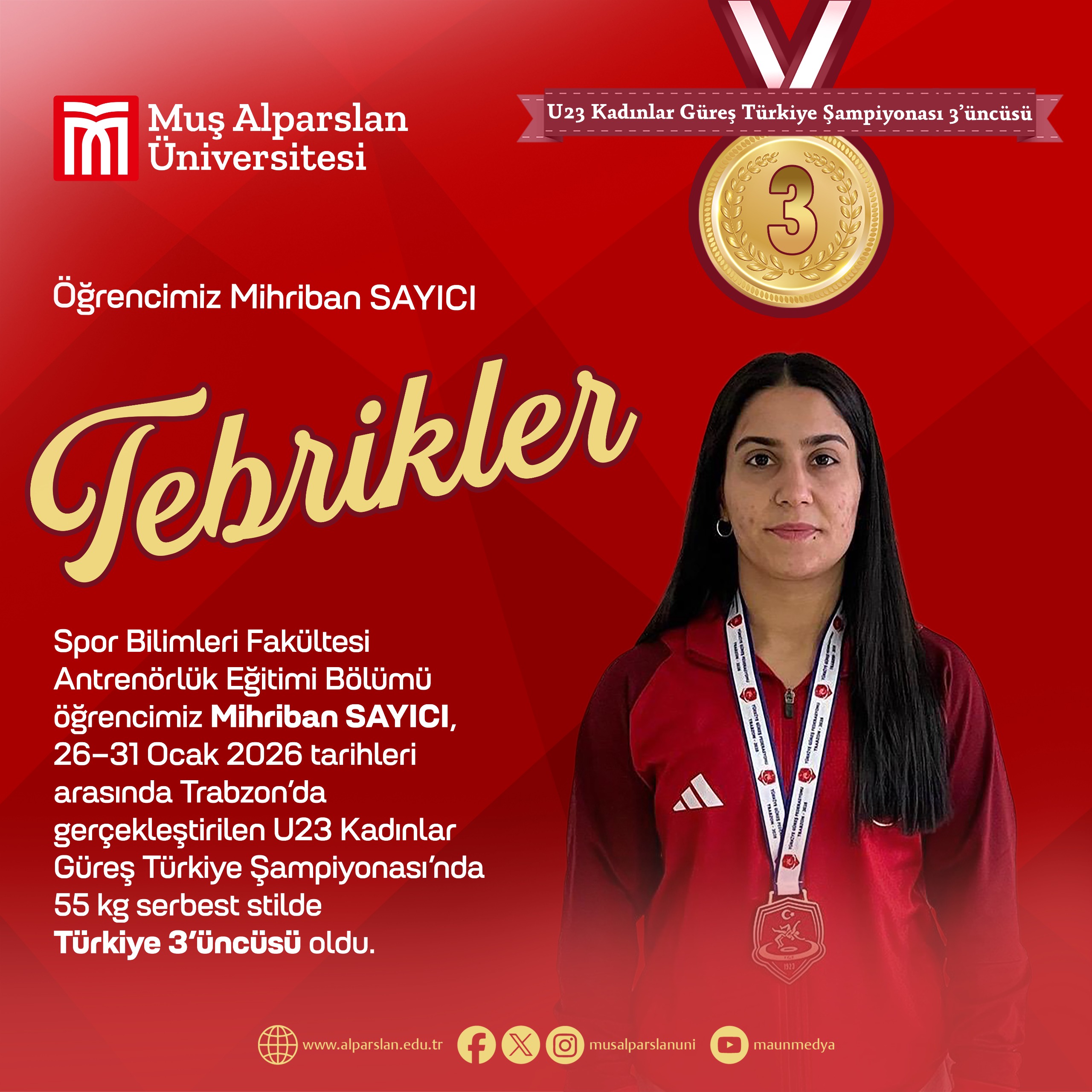 Spor Bilimleri Fakültesi Antrenörlük Eğitimi Bölümü öğrencimiz Mihriban Sayıcı, 26–31 Ocak 2026 tarihleri arasında Trabzon’da gerçekleştirilen U23 Kadınlar Güreş Türkiye Şampiyonası’nda 55 kg serbest stil kategorisinde Türkiye üçüncüsü oldu.