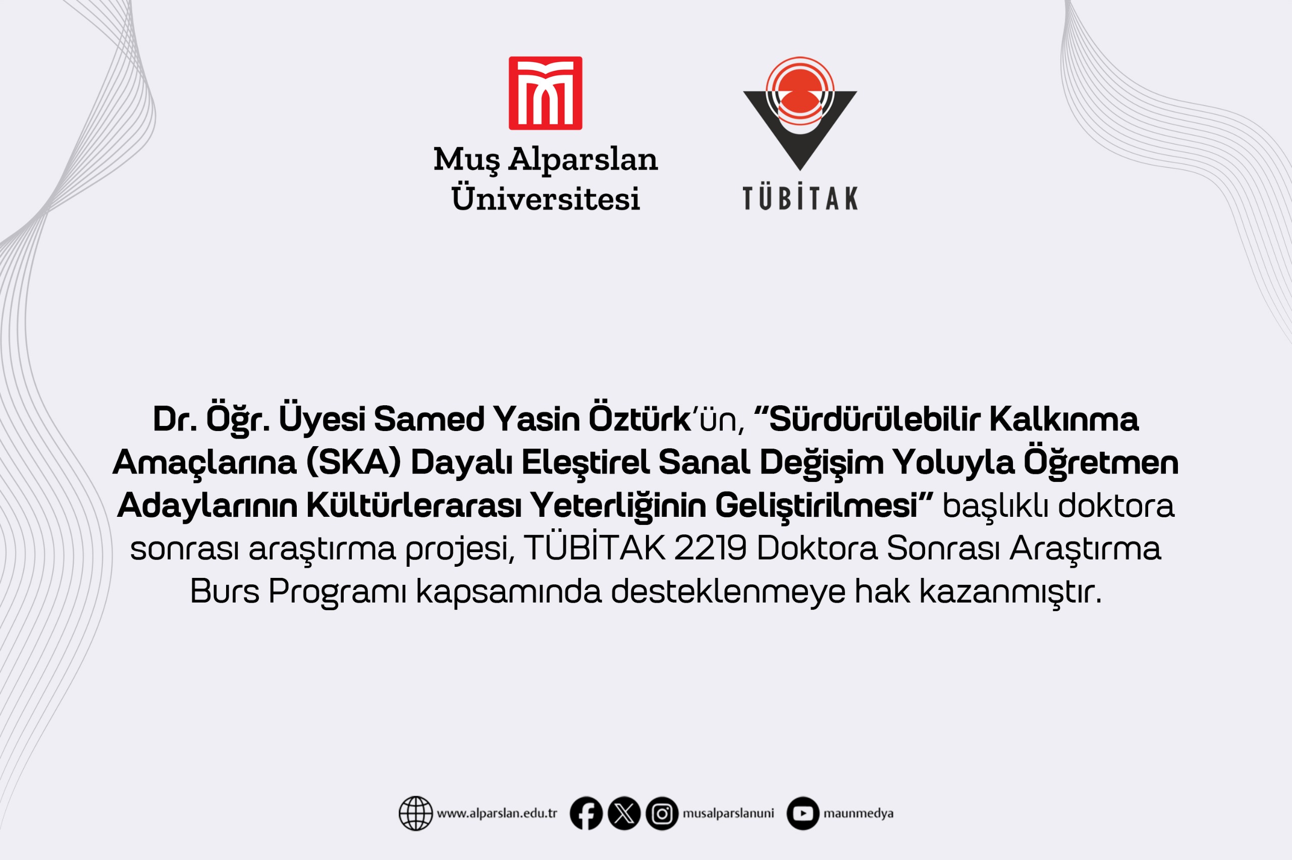 Fakültemiz İngiliz Dili Eğitimi Ana Bilim Dalı kadrosunda görev yapmakta olan Dr. Öğr. Üyesi Samed Yasin Öztürk’ün, “Sürdürülebilir Kalkınma Amaçlarına (SKA) Dayalı Eleştirel Sanal Değişim Yoluyla Öğretmen Adaylarının Kültürlerarası Yeterliğinin Geliştirilmesi” başlıklı doktora sonrası araştırma projesi, TÜBİTAK 2219 Doktora Sonrası Araştırma Burs Programı kapsamında desteklenmeye hak kazanmıştır.