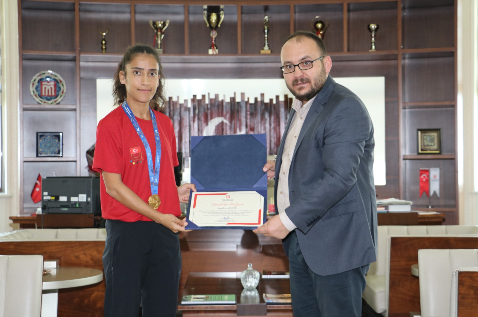 Ülkemiz ve üniversitemizin temsiline önemli bir katkı sunan Kunur'u, Rektörümüz Prof. Dr. Mustafa Alican, makamında misafir ederek, başarılarından dolayı öğrencimize plaket ve teşekkür belgesi takdim etti.