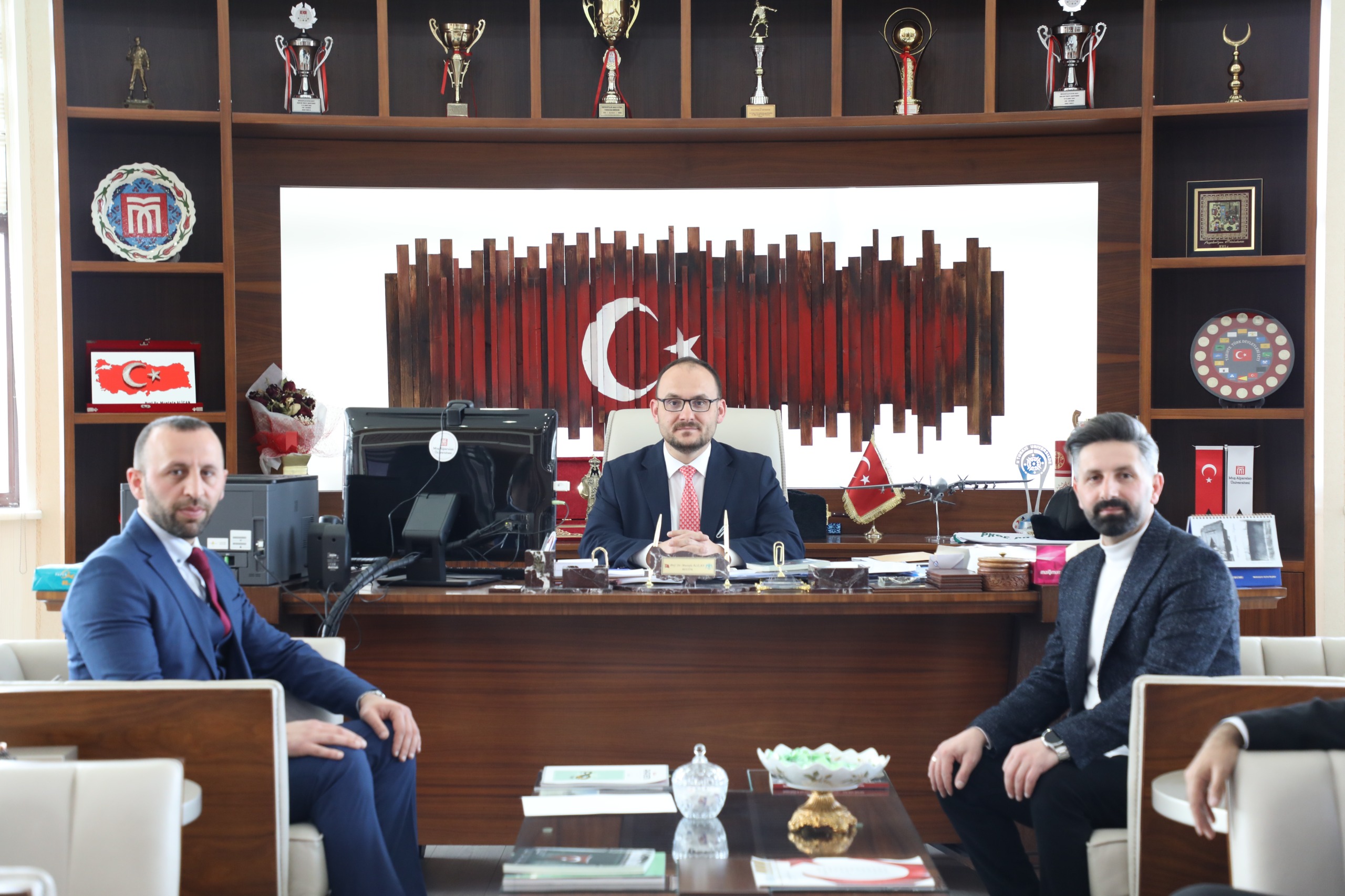 Muş Kültür Sanat Spor ve Doğa Derneği Başkanı Ufuk Bayrak, Yönetim Kurulu Üyeleri Ferhat Gürtürk ve Hamdusena Ardil ile birlikte Rektörümüz Prof. Dr. Mustafa Alican’ı makamında ziyaret etti.