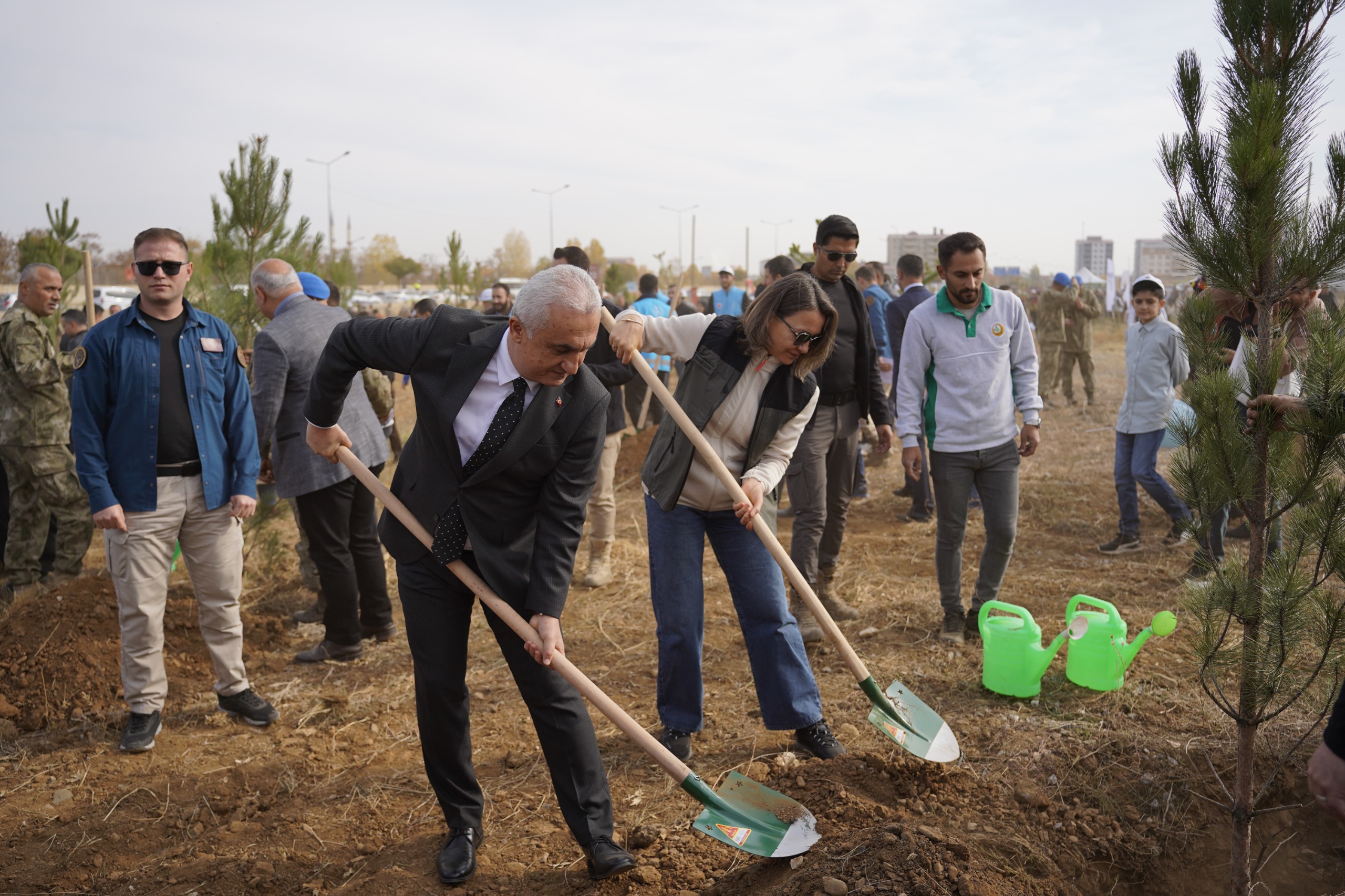 Muş Valisi Avni Çakır ve eşi Bahar Çakır Hanımefendi, il protokolü, öğrenciler ve vatandaşların katıldığı etkinlikte, katılımcılar doğayı koruma ve yeşil alanları artırma bilinciyle toprakla buluşarak fidan dikti.