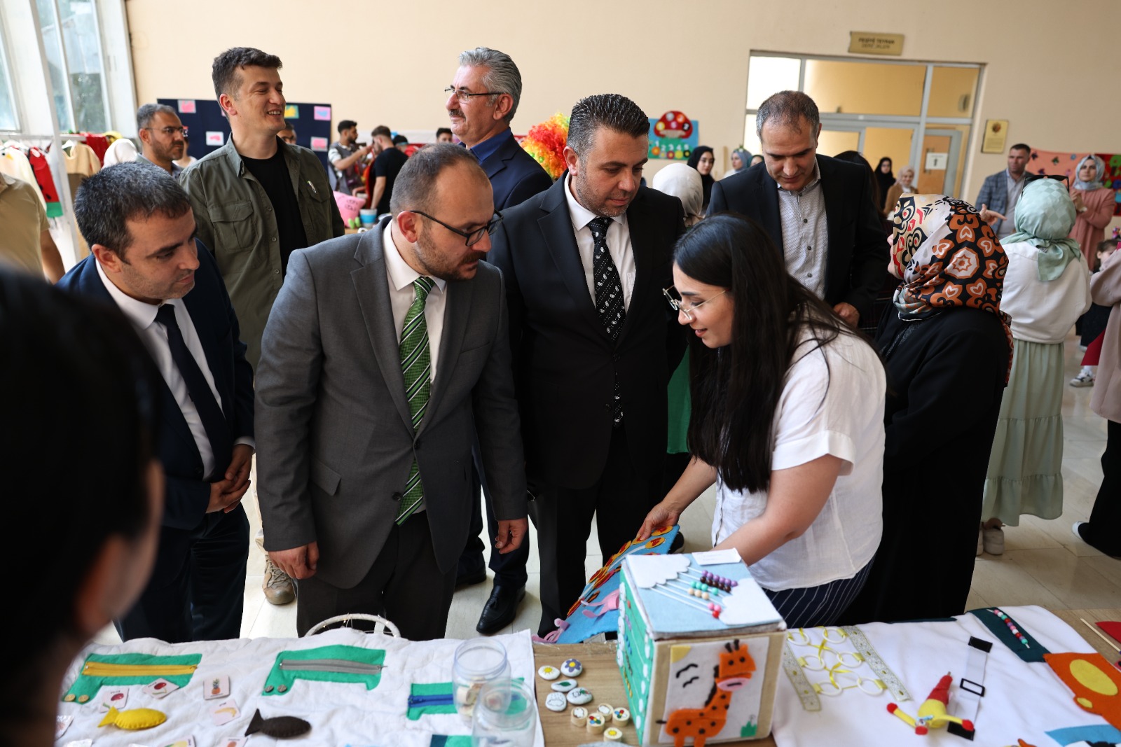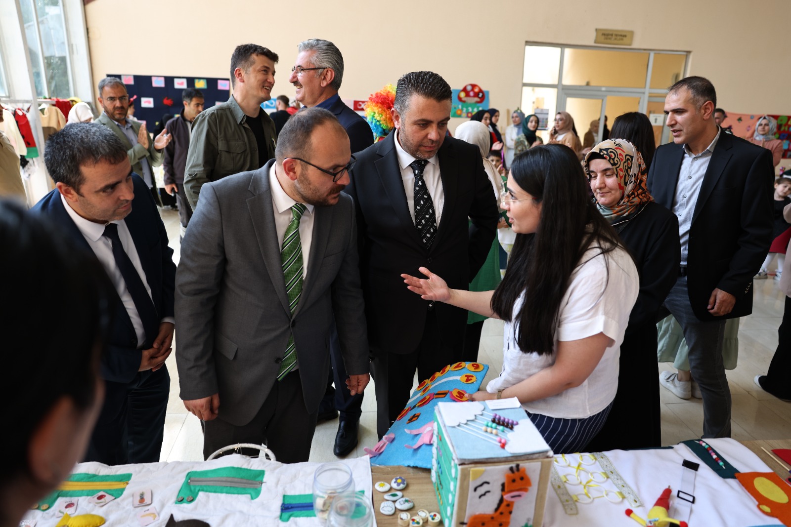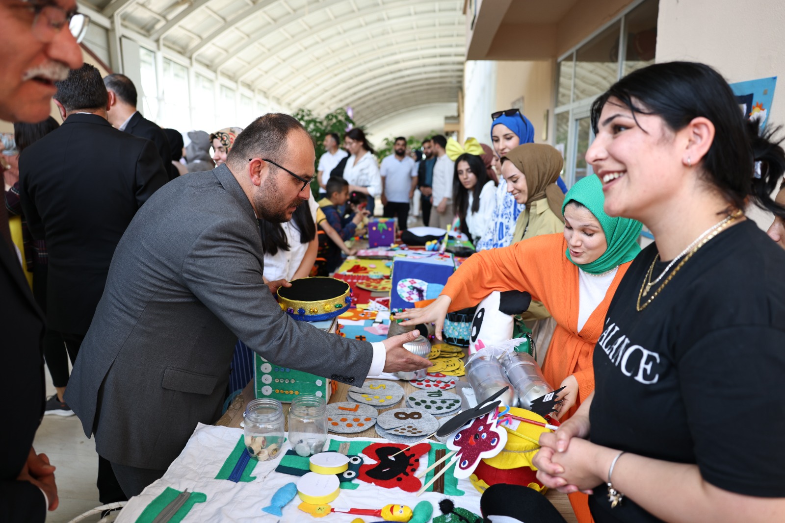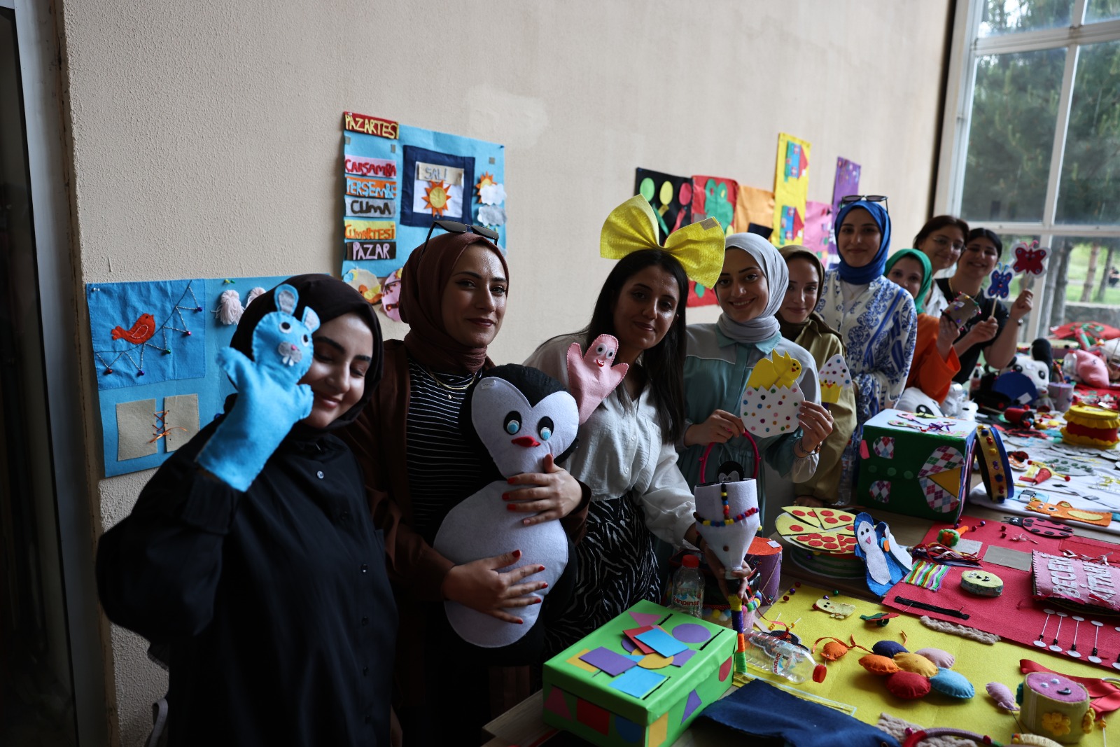 Çocuk gelişimi programı öğrencilerinin görev aldığı sergide öğrencilerin hazırladığı eğitici oyuncaklar, duyu materyalleri, hikâye anlatma materyalleri, kostümler, maskeler, beceri kutuları, kuklalar ve atık materyallerden oluşan çalışmalar sergilendi.