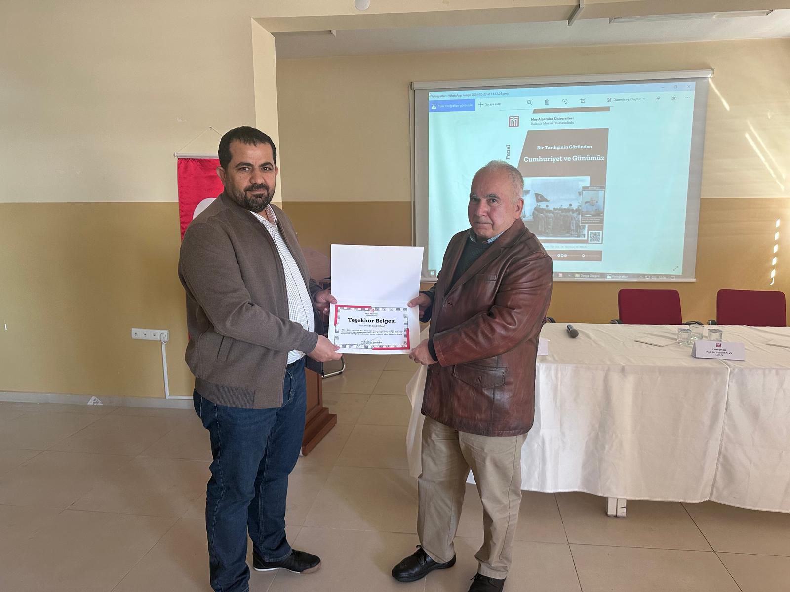 Panelin sonunda, Yüksekokul Müdürü Prof. Dr. İrşad Sami Yuca, Prof. Dr. Sabit Duman’a teşekkür belgesi takdim ederek etkinliği sonlandırdı.
