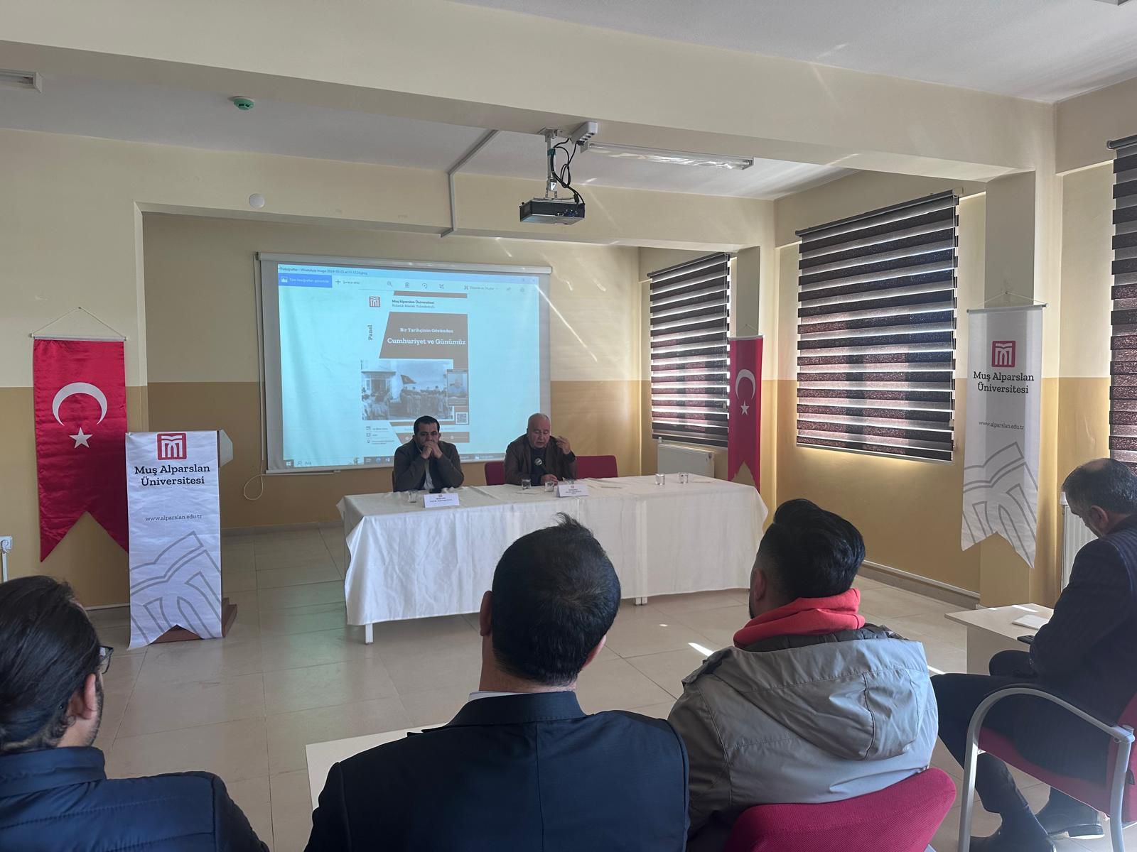 Cumhuriyetin 101’inci yılı etkinlikleri kapsamında, Muş Alparslan Üniversitesi Bulanık Meslek Yüksekokulu’nda Öğr. Gör. Neriman Morkoç’un koordinatörlüğünde gerçekleştirilen “Bir Tarihçinin Gözüyle Cumhuriyet ve Günümüz” isimli panelde, Muş Alparslan Üniversitesi Spor Bilimleri Fakültesi Dekanı ve Tarihçi Prof. Dr. Sabit Duman ağırlanarak Cumhuriyet'in tarihsel ve güncel anlamı üzerine konuşmalar yapıldı.