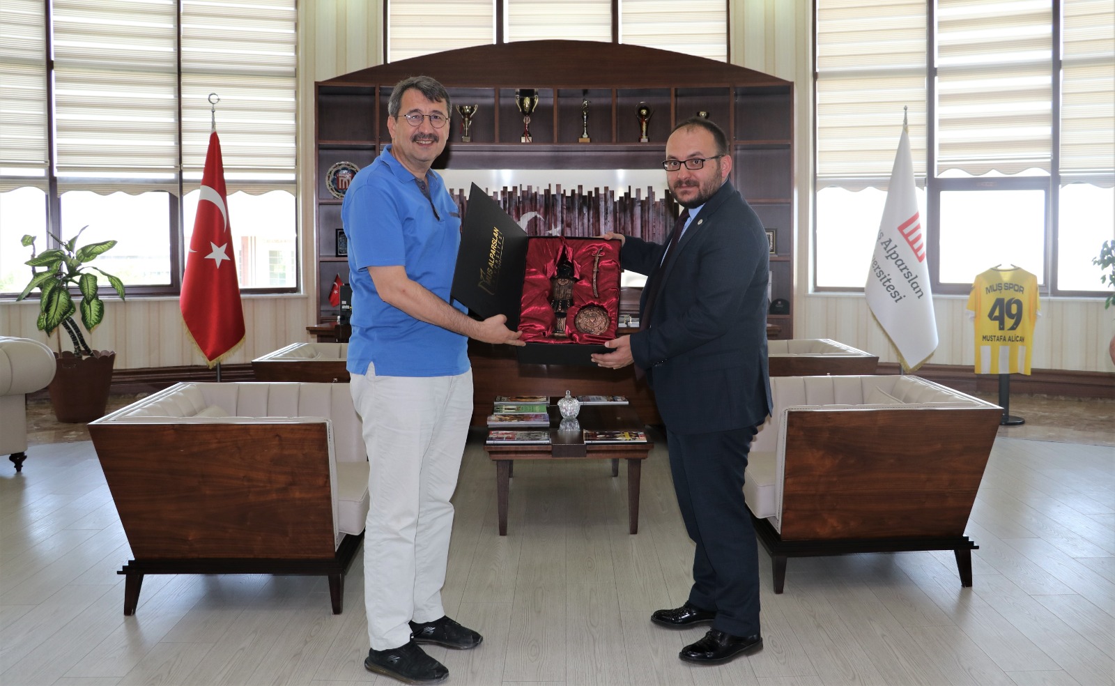 Malazgirt etkinlikleri kapsamında Muş'a gelen İbn Haldun Üniversitesi Rektörü Prof. Dr. Atilla Arkan, Rektörümüz Prof. Dr. Mustafa Alican'ı makamında ziyaret etti. Rektörümüze hayırlı olsun dileklerini ileten Arkan Malazgirt etkinlikleri hakkında da bilgi aldı. Hediye takdimin gerçekleştiği görüşmenin ardından Malazgirt projesi kapsamında sürdürülen kazı çalışmalarını yerinde ziyaret ettiler.
