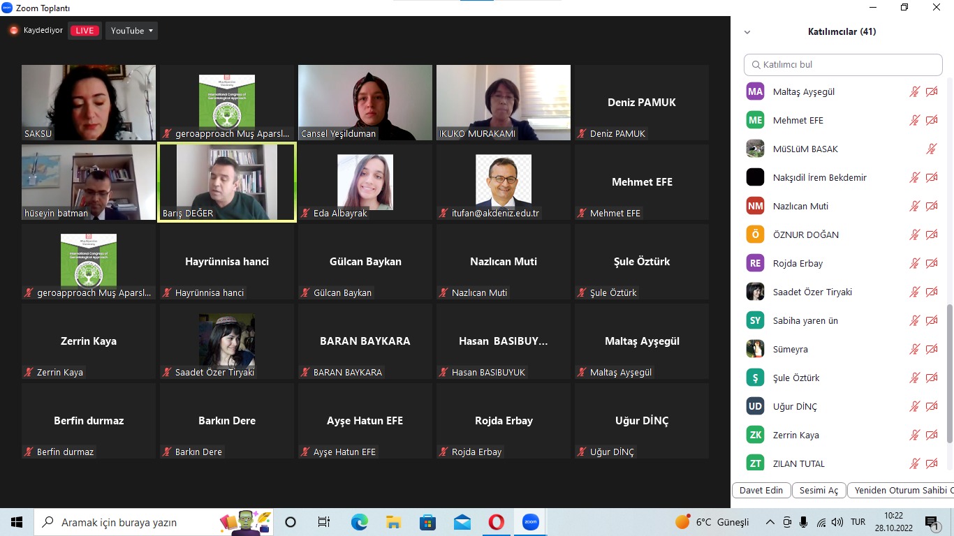 İki gün boyunca devam eden kongrenin açılış konuşmaları Rektörümüz Prof. Dr. Fethi Ahmet Polat, Sağlık Bilimleri Fakültesi Dekanı Prof. Dr. Hüseyin Kırımoğlu, Akdeniz Üniversitesi Gerontoloji Bölümü Kurucu Başkanı Prof. Dr. İsmail Tufan, Engelli ve Yaşlı Hizmetleri Genel Müdürü Elmas Esra Ceceli ve Gerontoloji Bölüm Başkanı ve Kongre Başkanı Dr. Öğretim Üyesi Mehmet Efe tarafından yapıldı.