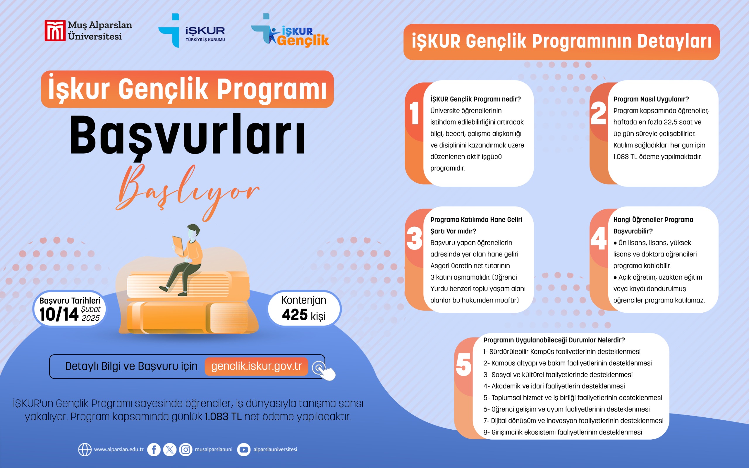 Öğrenciler 17-21 Şubat 2025 tarihleri arasında www.iskur.gov.tr adresi üzerinden başvurularını gerçekleştirebilirler. Programın detaylarına ulaşmak için www.genclik.iskur.gov.tr adresi ziyaret edilebilir.