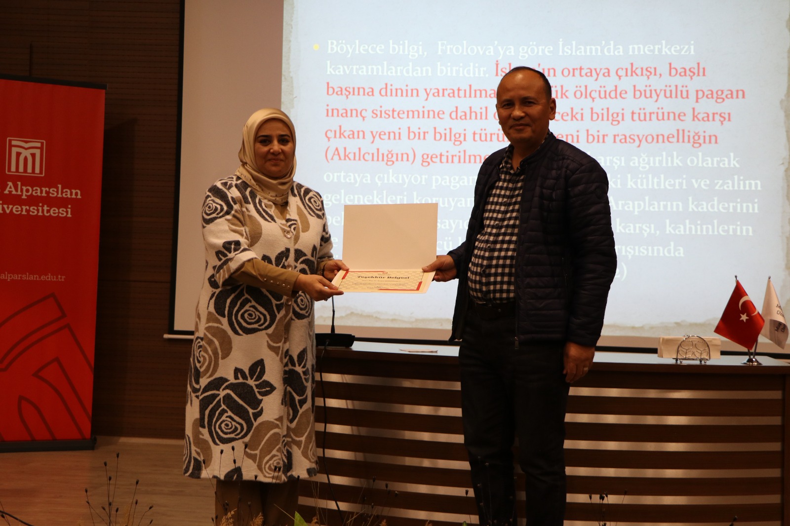 Muş Alparslan Üniversitesi İslami İlimler Fakültesi Konferans Salonu’nda “Nizamiye Sohbetleri” programının ikinci bölümü, Dokuz Eylül Üniversitesi İlahiyat Fakültesi Felsefe ve Din Bilimleri Anabilim Dalı Öğretim Üyesi Doç. Dr. Kasım Müminoğlu’nun katılımıyla gerçekleşti. Müminoğlu, “E.A. Frolova’da Kur’an ve Akılcılık” başlıklı konuşmasında Rus filozof E.А. Frolova’nın Kur’an ve akılcılık üzerine geliştirdiği düşüncelerini katılımcılarla paylaştı.