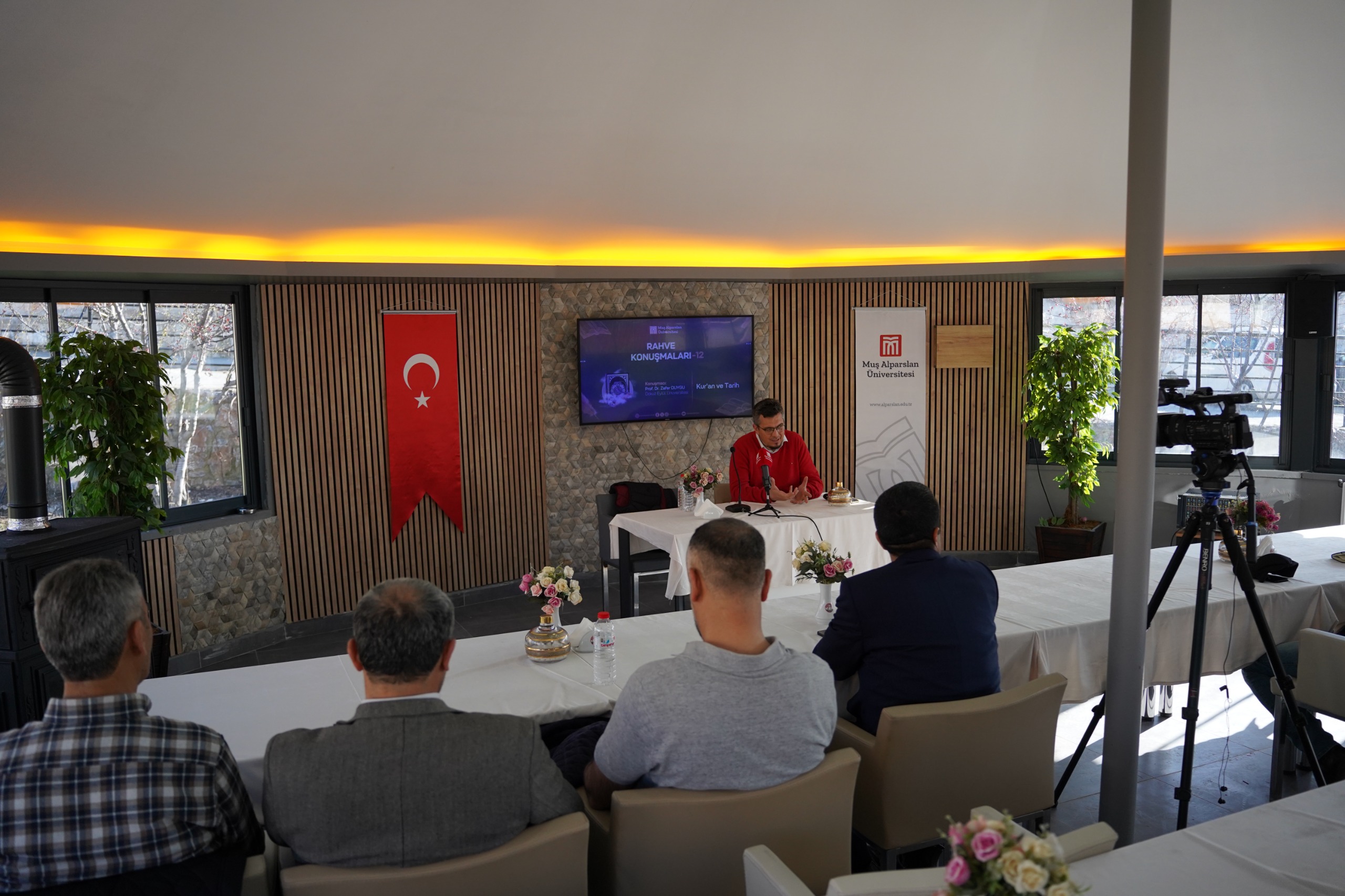 “Kur’ân ve Tarih” başlığıyla düzenlenen söyleşide Prof. Dr. Duygu, Kur’ân’ın tarihsel bağlamı, tarihselcilik yaklaşımları ve İslam düşüncesindeki tarih algısı üzerine kapsamlı bir sunum gerçekleştirdi.