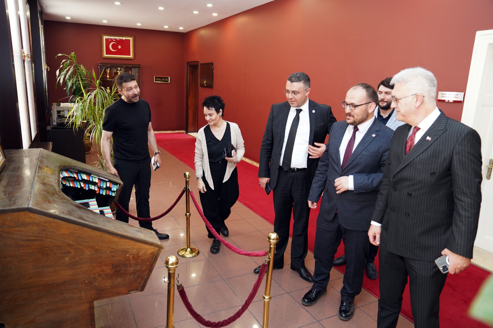 Devlet Tiyatroları Genel Müdürü Tamer Karadağlı’nın misafiri olarak gerçekleşen buluşmada, önemli konular masaya yatırıldı. Rektör Danışmanlarımız Doç. Dr. Mehmet Özalper ve Dr. Öğretim Üyesi Ender Can Dönmez'in de katıldığı ziyaret çerçevesinde, Muş’a Devlet Tiyatroları İl Müdürlüğü kurulması ve turne rotalarına Muş’un eklenmesi gibi konular öncelikli olarak ele alındı. Ayrıca Üniversitemizin kültürel ve sanatsal faaliyetlerine destek verme hususunda Devlet Tiyatroları ile iş birliğinin yapılması ve Muş’ta sahnelenecek yeni oyunlar konusunda da fikir alışverişi yapıldı.