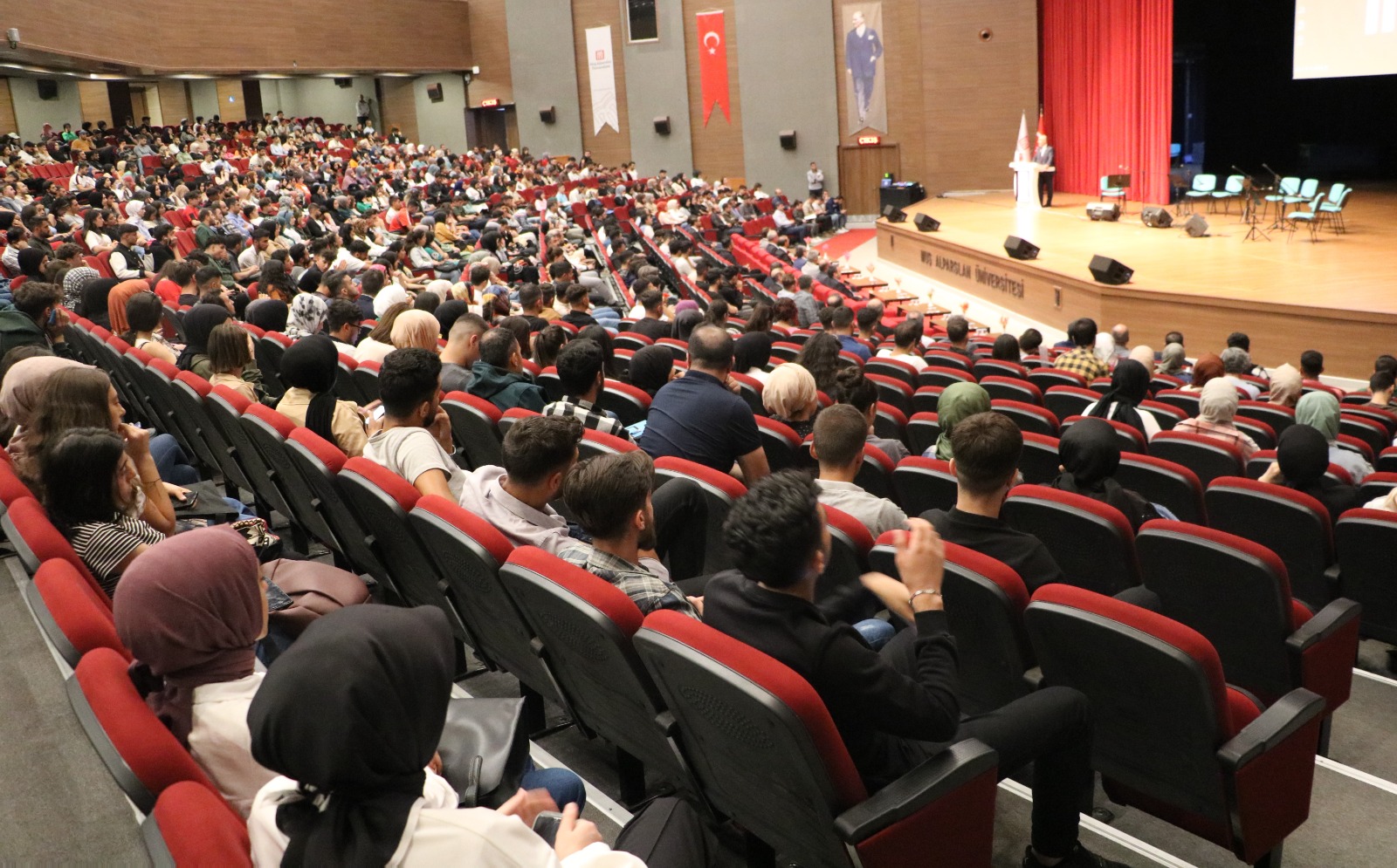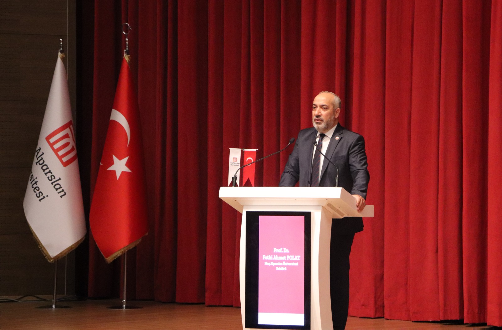 1071 Malazgirt Kongre ve Kültür Merkezinde düzenlenen toplantıya Rektör Yardımcılarımız Prof. Dr. Yaşar Karadağ, Prof. Dr. Murad Aydın Şanda, Prof. Dr. Ulaş Çaydaş, Genel Sekreter Harun Demir, dekanlar, akademik personel, öğrenciler ve yerel basın katıldı.