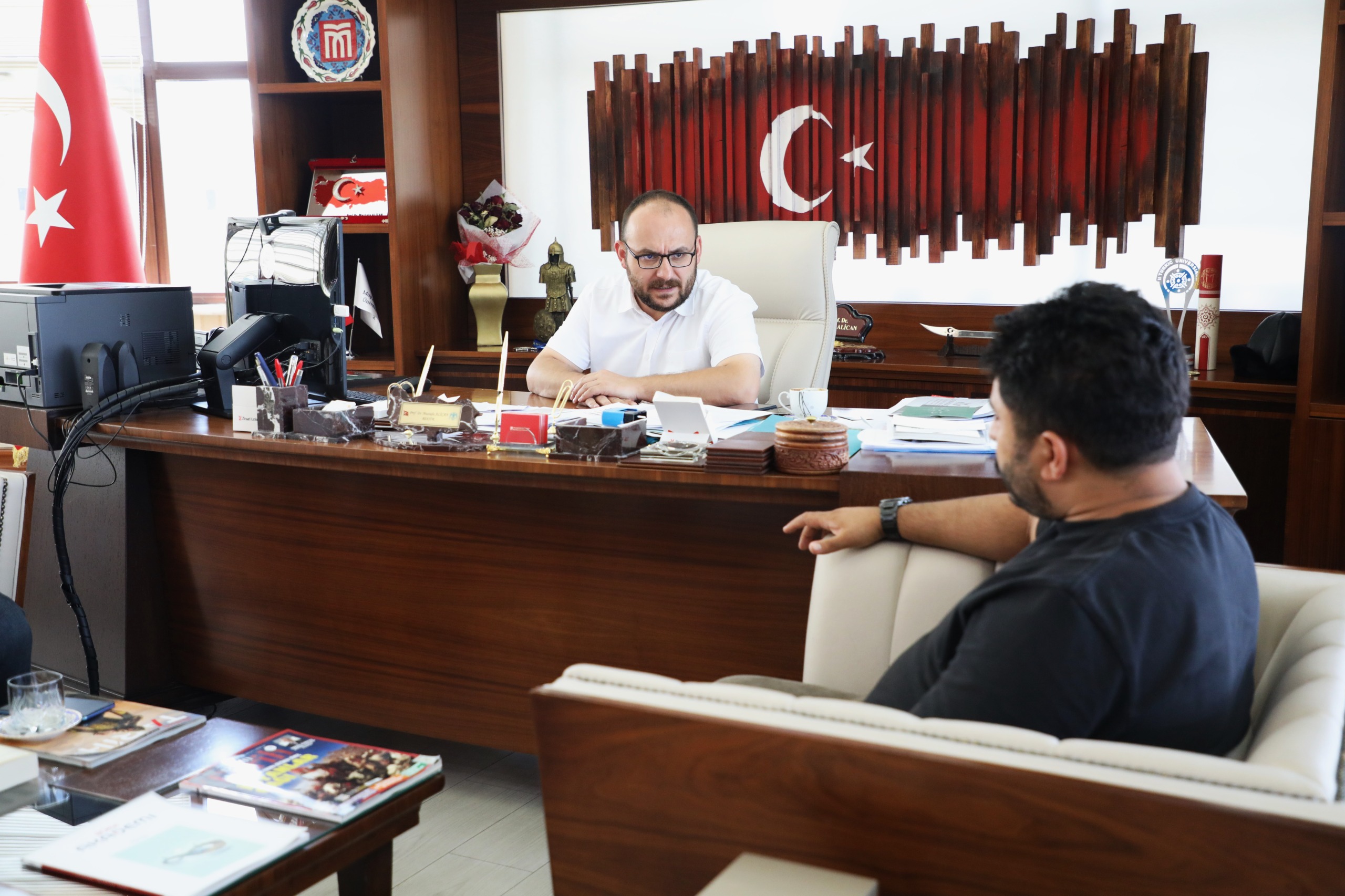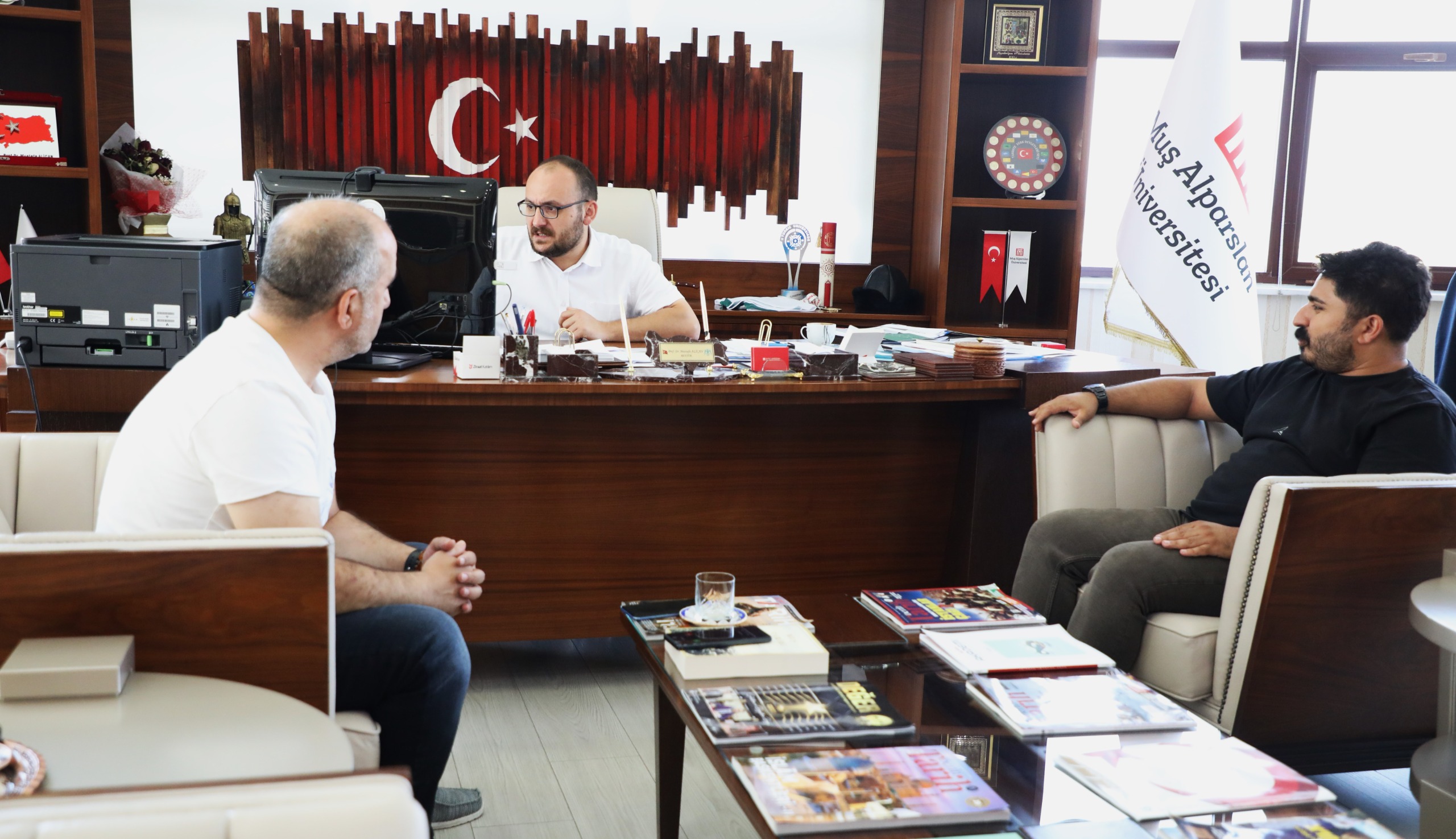 İnönü Üniversitesi Eğitim Fakültesi Dr. Öğretim Üyesi Tuğrul Gökmen Şahin ve Elazığ Milli Eğitim Müdürlüğü mensubu Dr. Muhammet Özcan, Rektörümüz Prof. Dr. Mustafa Alican'ı makamında ziyaret etti.