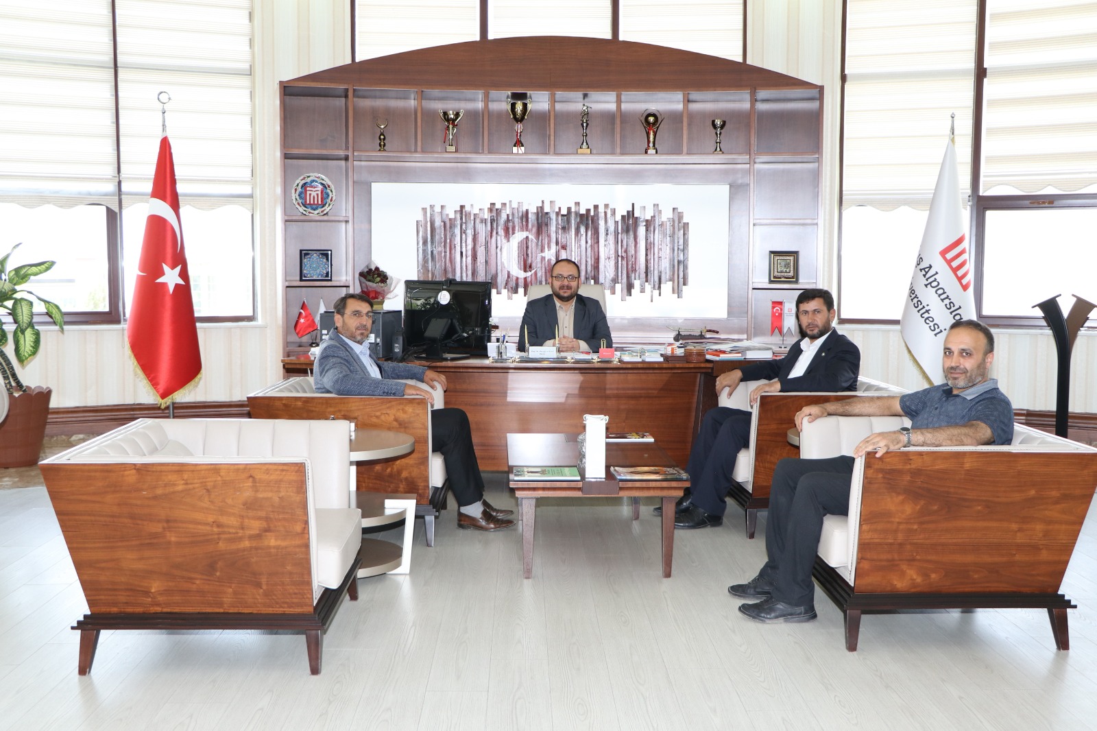 Üniversitemiz Rektörü Prof. Dr. Mustafa Alican'a dönük tebrik ziyaretleri hız kesmeden devam ediyor. Bursa Muşlu Sanayici ve İş Adamları Derneği Başkanı Ayhan Durgun, Muş Kızılay Kan Hizmetleri Sorumlusu Şaban Çelik, HÜDA-PAR Muş İl Başkanı Mehmet Şirin Çağlayan ve emekli imam Abdülkadir Erten rektörümüzü ziyaret ederek, "hayırlı olsun" dileklerini ilettiler.