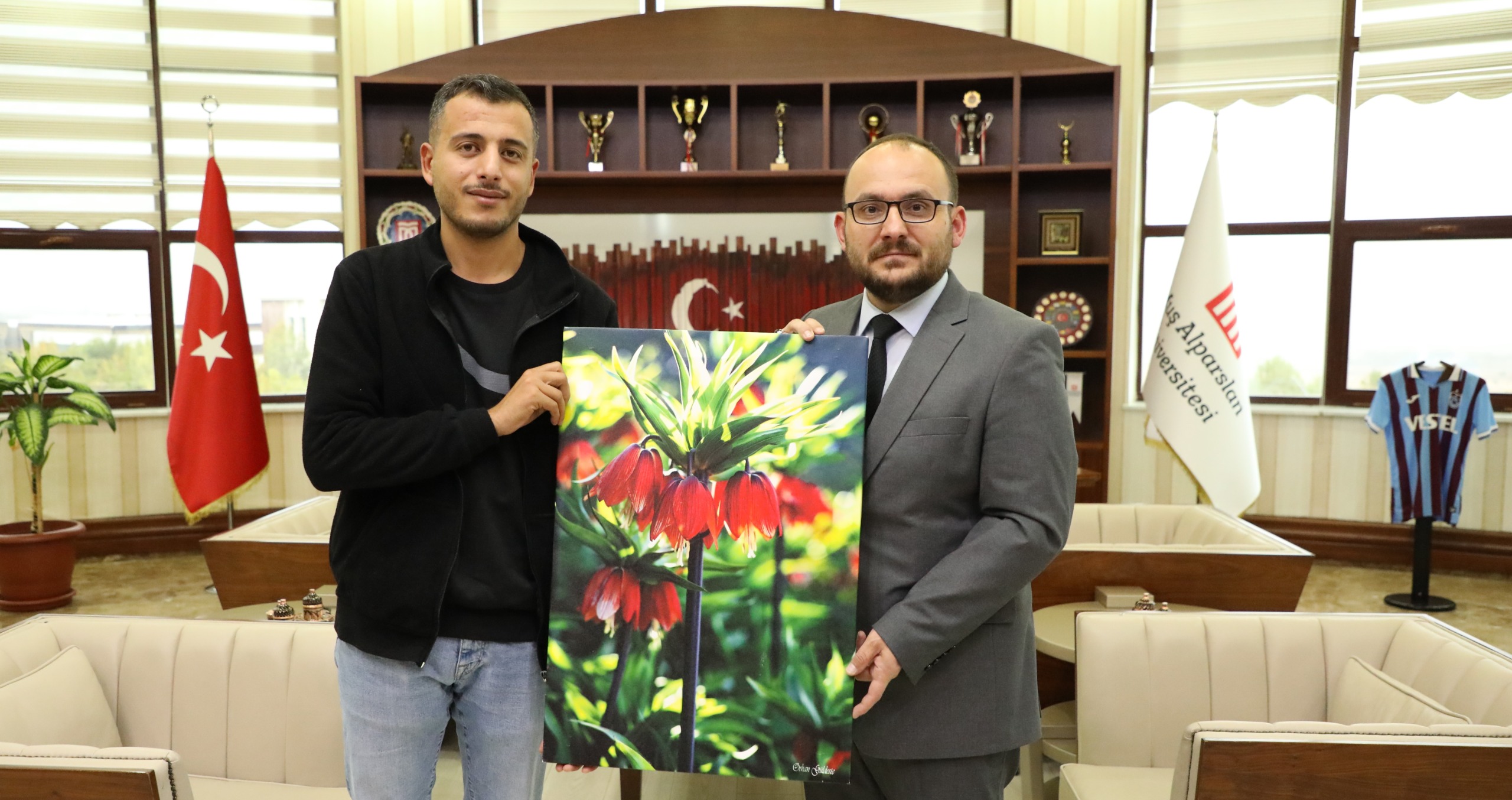 Ziyaret sırasında Muş ilinde 1700 rakımda yetişen ve yalnızca Nisan ayında on beş günlük ömrü olan Ters Lâle’yi fotoğraf hâline getirerek Rektörümüze takdim ettiler.