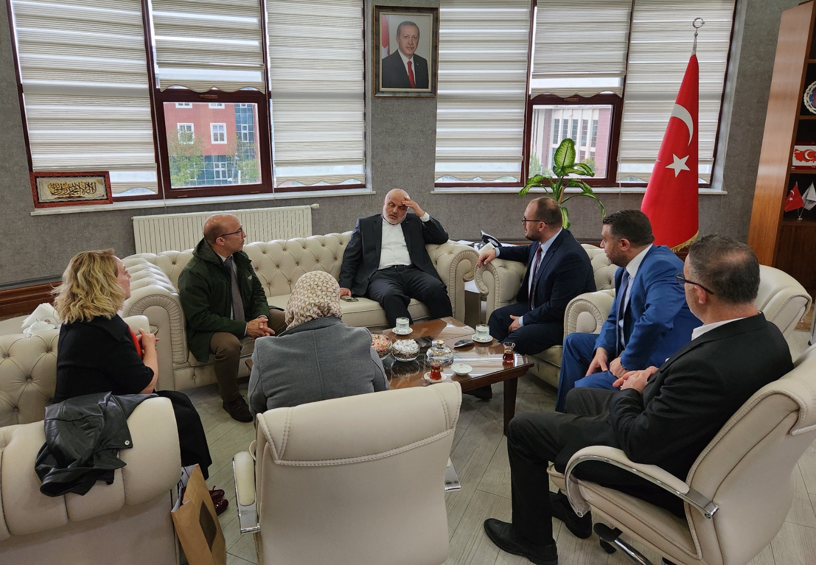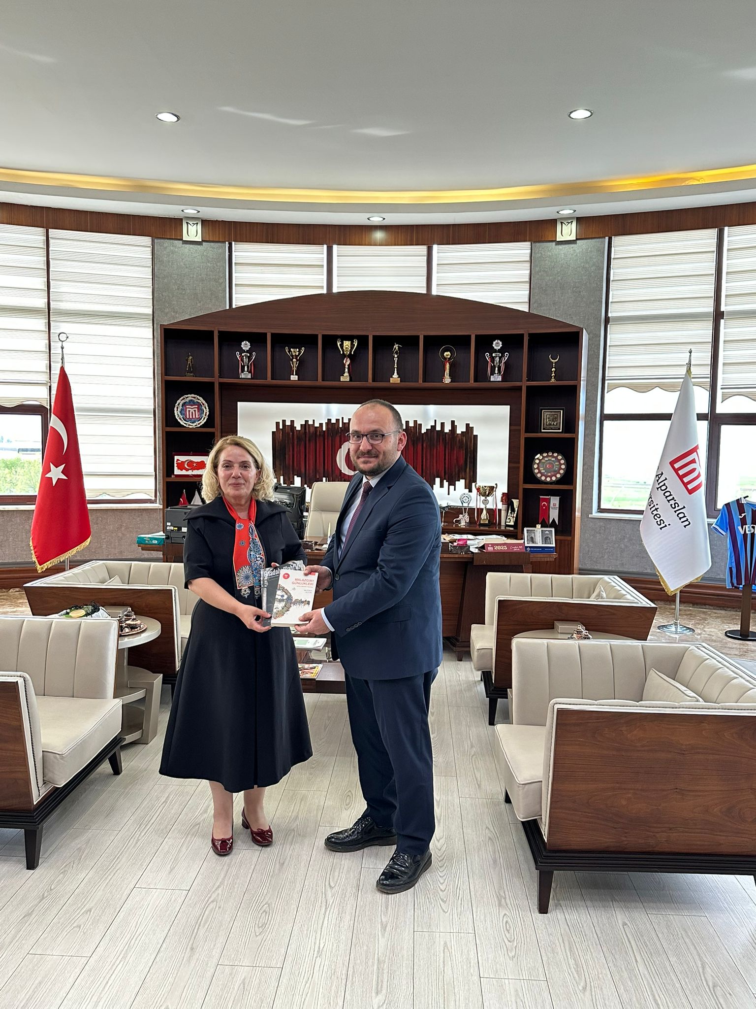 Üniversitemizde 15-16 Mayıs tarihleri arasında düzenlenecek olan Uluslararası Türkoloji Araştırma Sempozyumu kapsamında, Malatya İnönü Üniversitesi Fen-Edebiyat Fakültesi Tarih Bölümü Başkanı Prof. Dr. Neslihan Durak ile Diyanet İşleri Başkanlığı Vaizi Dr. Muhammet Masum Vanlıoğlu, Rektörümüz Prof. Dr. Mustafa Alican’ı makamında ziyaret etti.