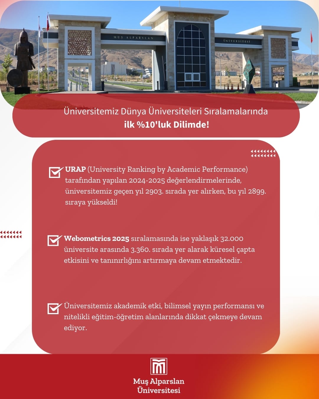 URAP tarafından gerçekleştirilen 2024-2025 değerlendirmelerinde, üniversitemiz dünya genelinde geçen yıl 2.903. sırada yer alırken, bu yıl 2.899. sıraya yükseldi. Webometrics 2025 sıralamasında ise yaklaşık 32.000 üniversite arasında 3.360. sırada yer alarak küresel çapta etkisini ve tanınırlığını artırmaya devam etmektedir.
