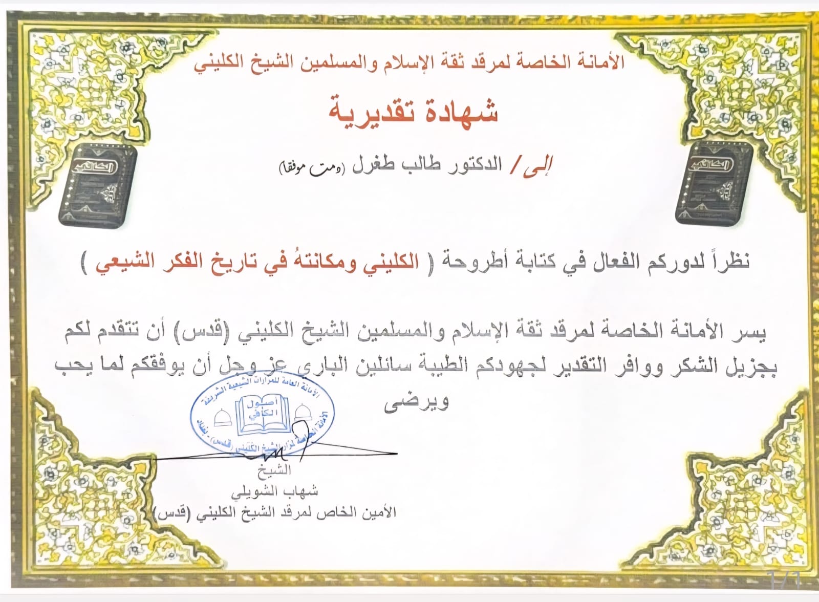 Üniversitemiz öğretim elemanlarından Öğr. Gör. Dr. Talip Tuğrul’un “Küleynî ve Şiî Düşünce Tarihindeki Yeri” adlı çalışması, Irak’ın başkenti Bağdat’ta faaliyet gösteren Şeyh Küleynî Kurumu tarafından takdir belgesi ile ödüllendirildi.