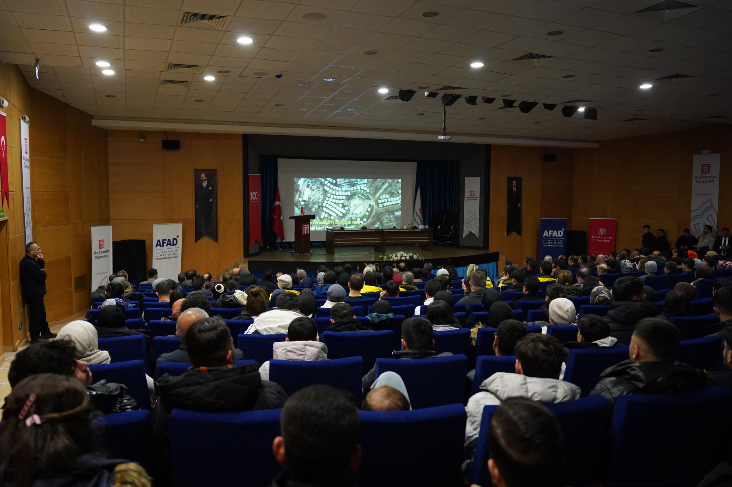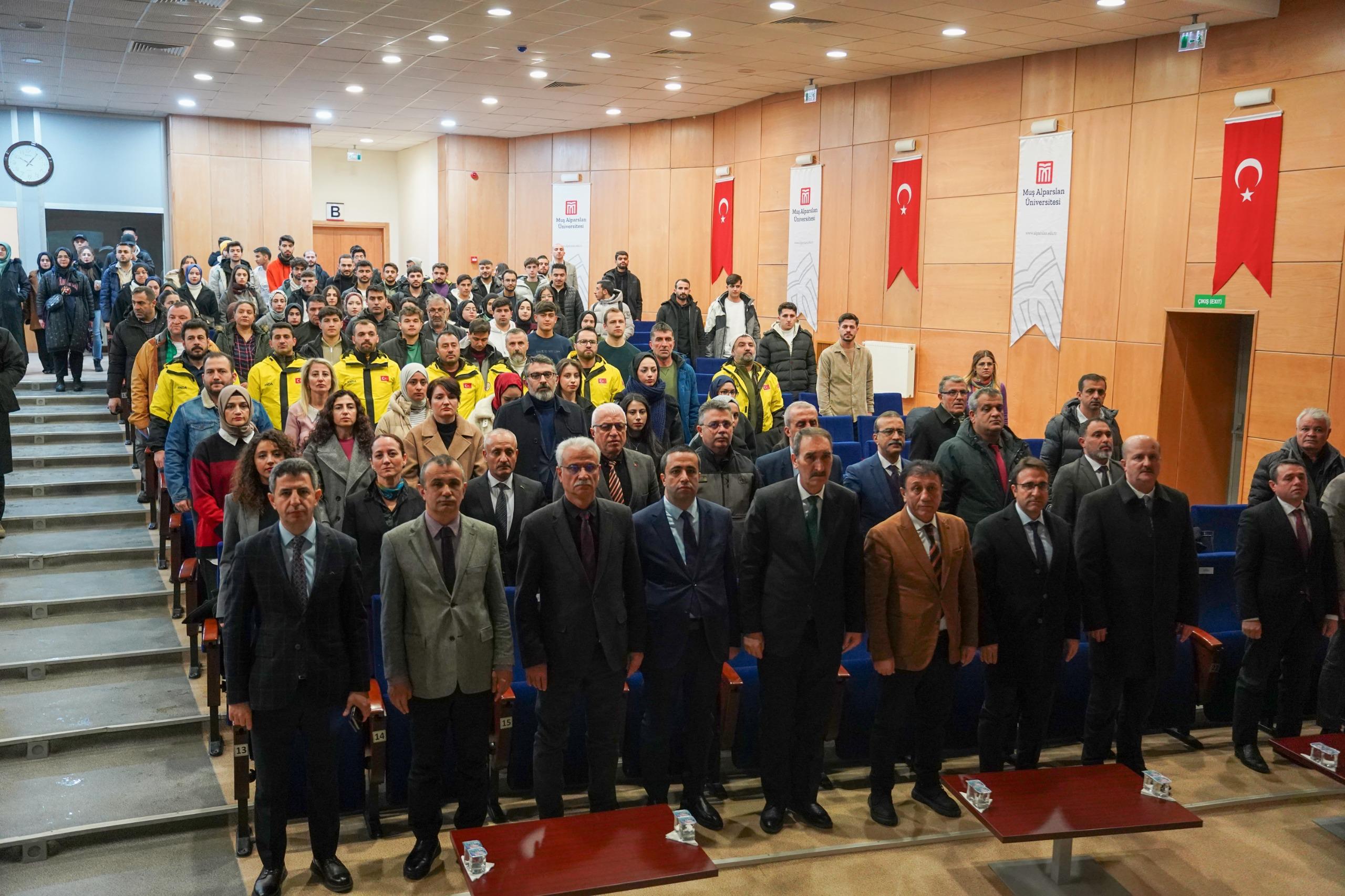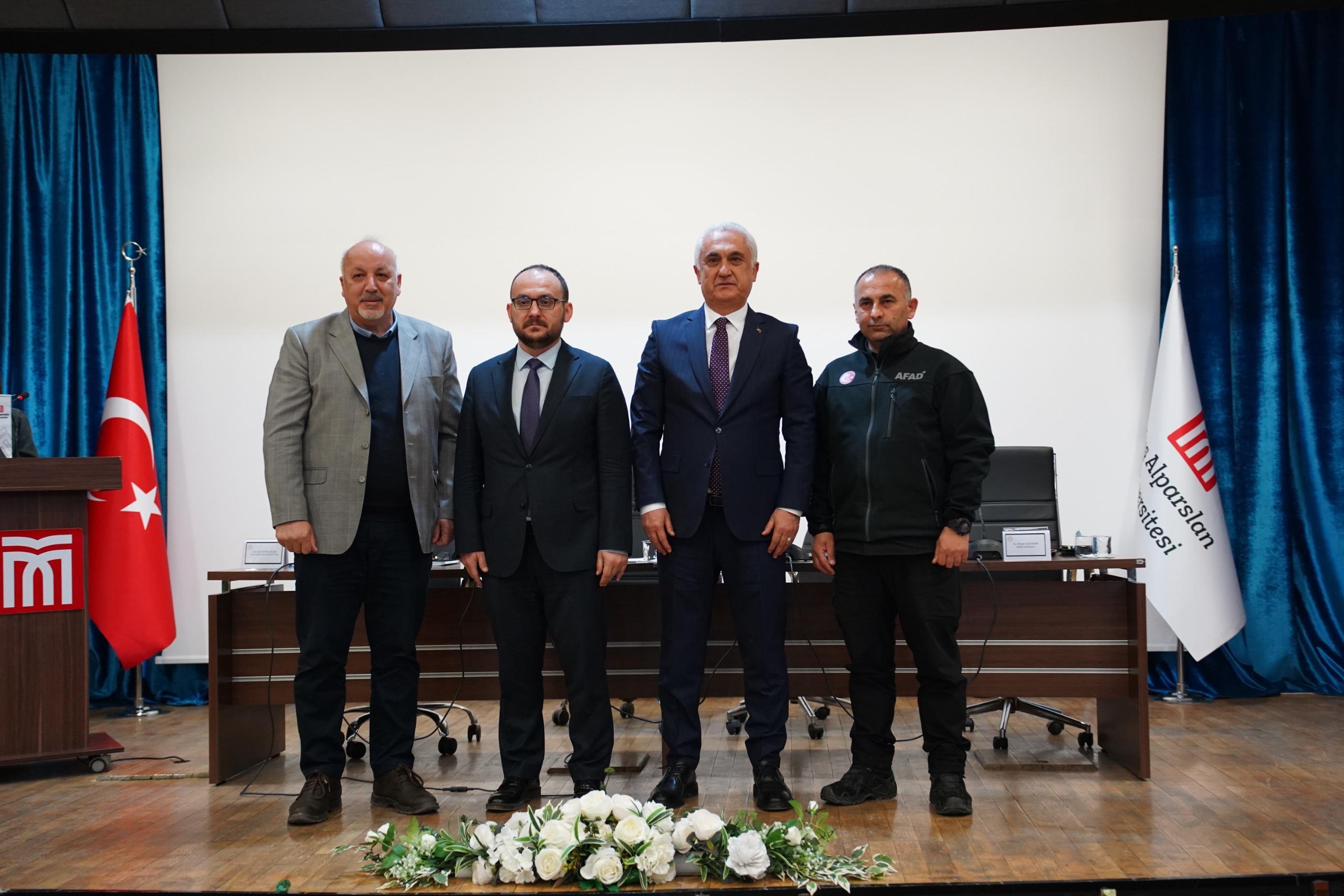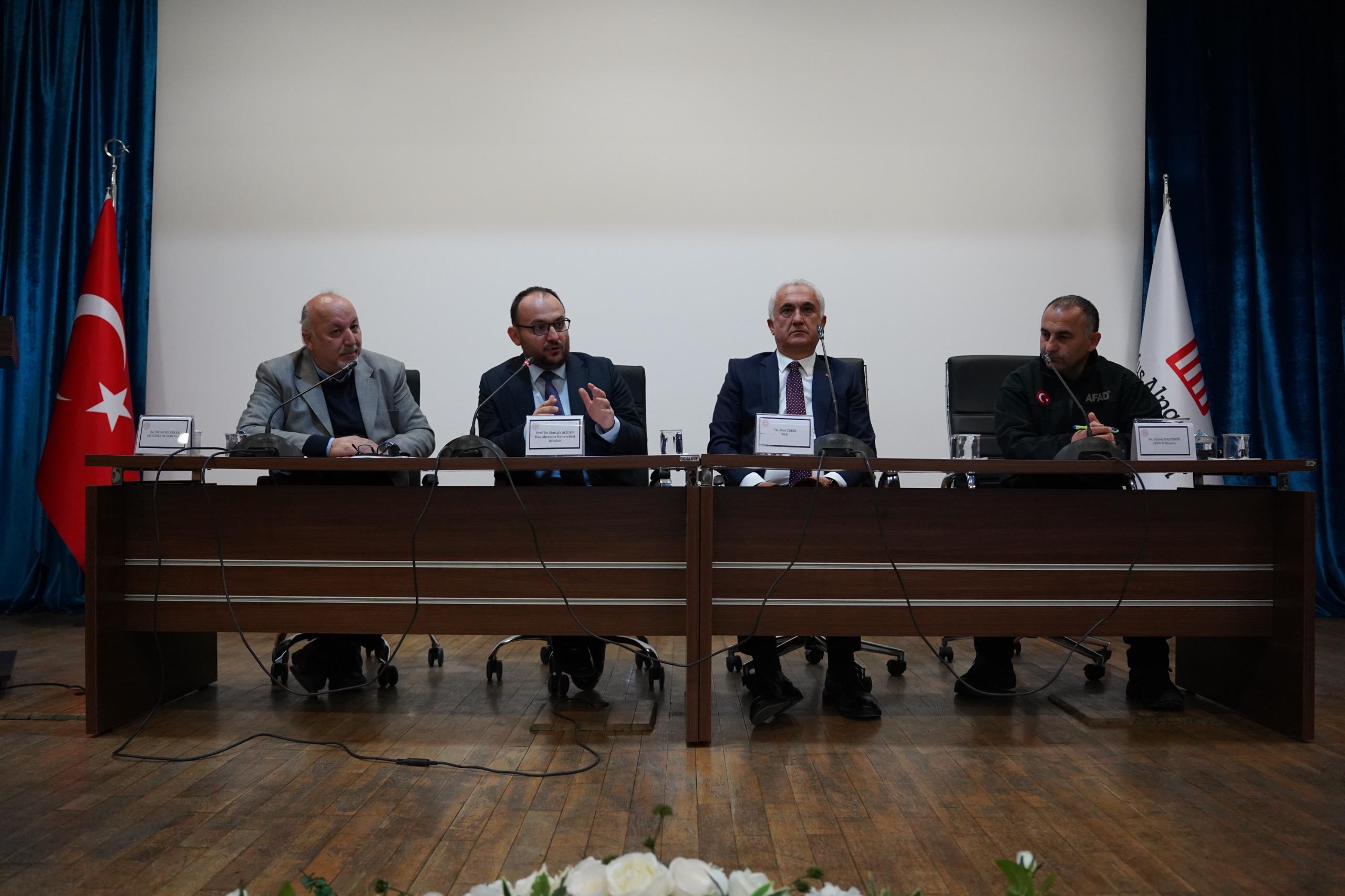 Prof. Dr. Sabahattin Zaim Konferans Salonu’nda düzenlenen etkinliğe Muş Valisi Avni Çakır, Rektörümüz Prof. Dr. Mustafa Alican, AFAD İl Müdürü Ahmet Daşdemir ve Dr. Öğr. Üyesi İskender Dölek konuşmacı olarak katıldı.