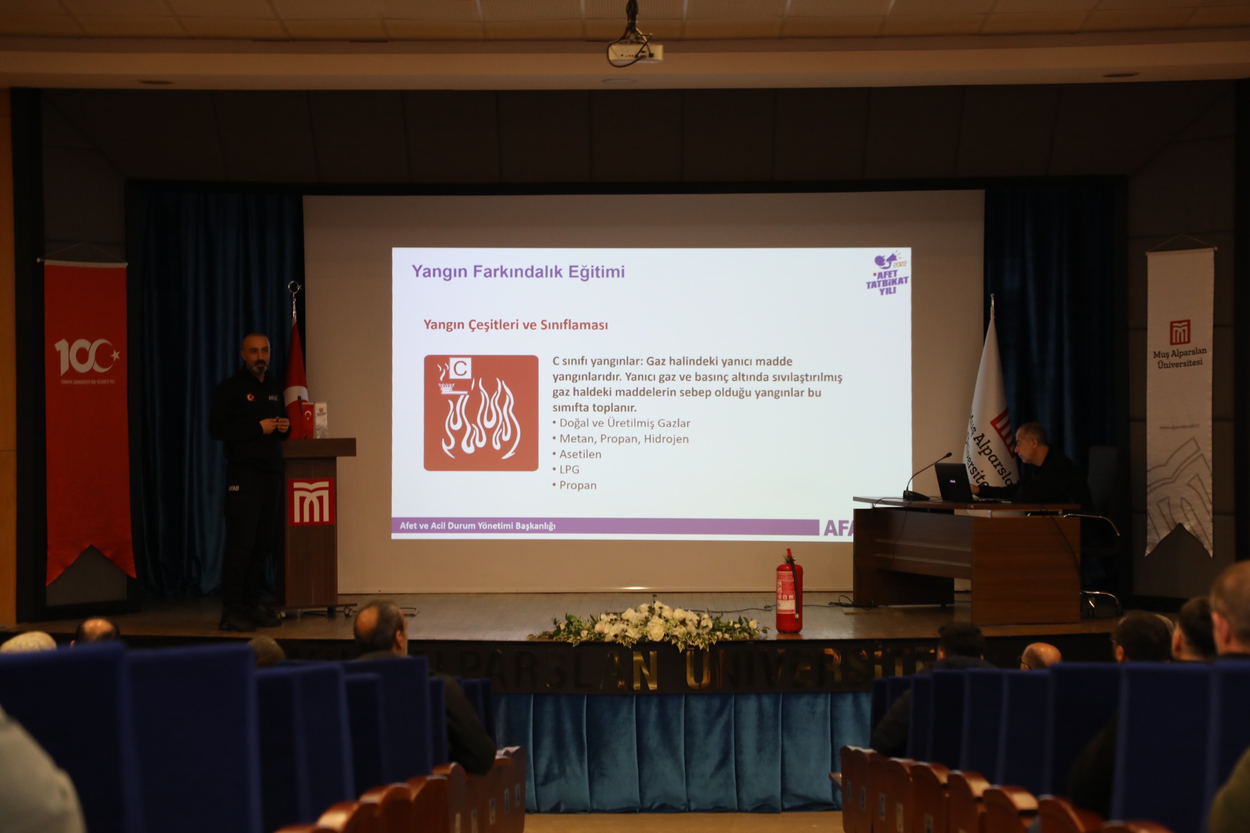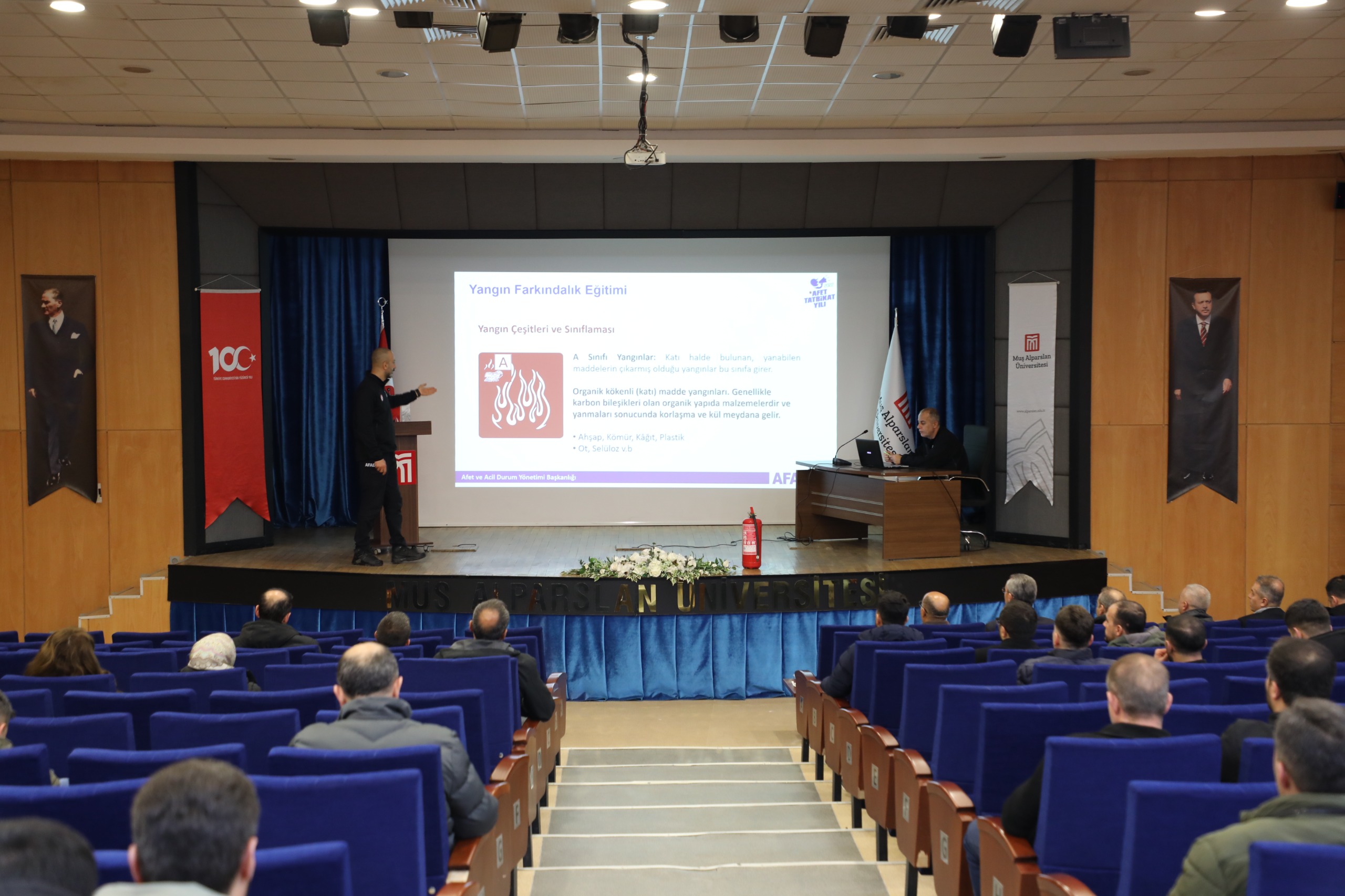 Eğitim, Afet ve Acil Durum Yönetimi Başkanlığı (AFAD) ekipleri tarafından verildi. Program kapsamında katılımcılara yangın öncesinde alınması gereken önlemler, yangın anında doğru müdahale yöntemleri, yangın söndürme ekipmanlarının etkin kullanımı ve güvenli tahliye süreçleri hakkında bilgi aktarıldı.