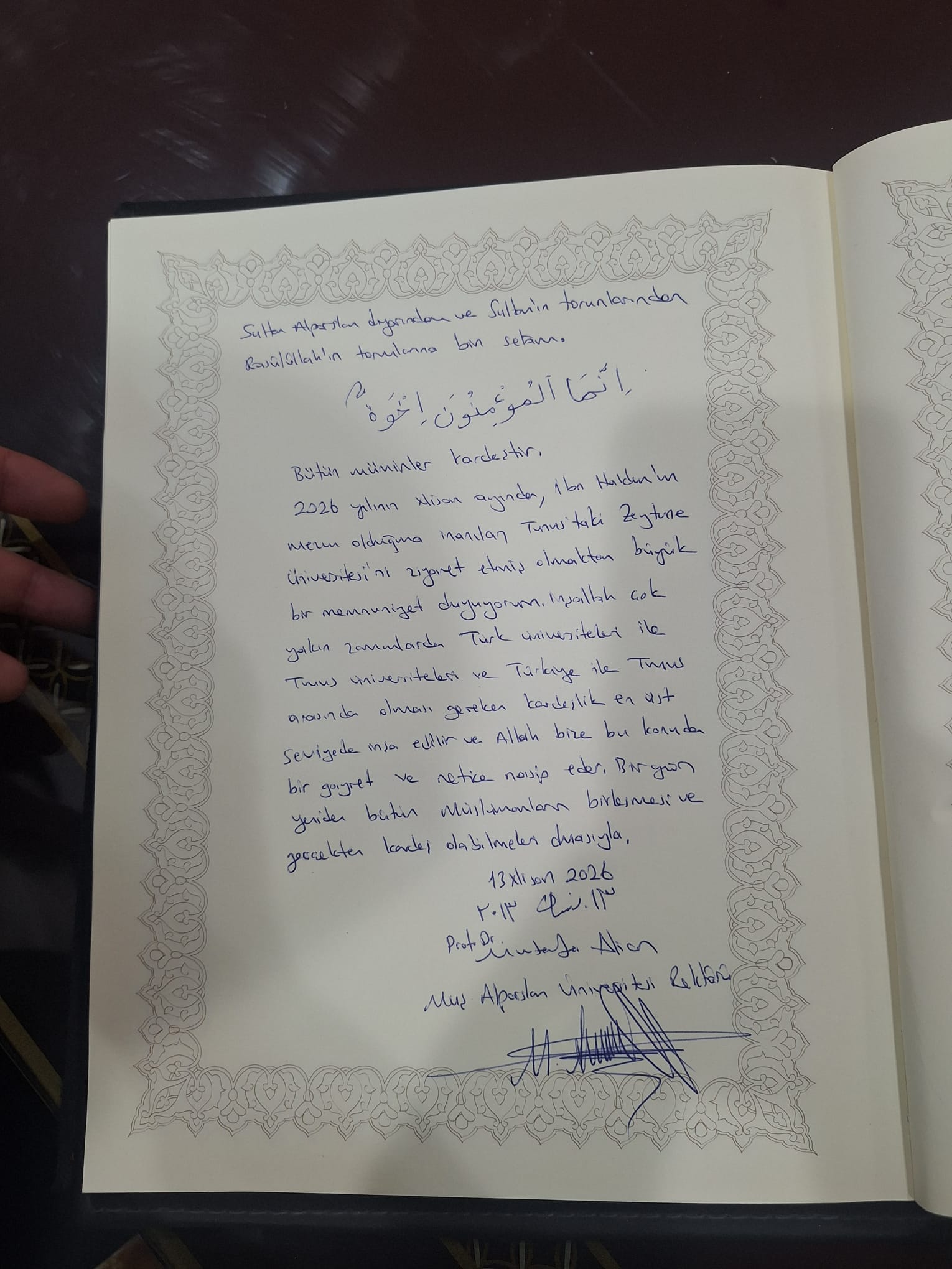 Rektörümüz Prof. Dr. Mustafa Alican ve Tunus Ez-Zitouna Üniversitesi Rektörü Prof. Dr. Abdellatif Bouazizi tarafından imza altına alınan anlaşma ile özellikle ilahiyat alanında akademik iş birliğinin geliştirilmesi, öğretim elemanı ve öğrenci değişimlerinin artırılması hedeflenmektedir. Tarihsel köklülüğü ile bilinen ve İbn Haldun’un da eğitim gördüğü önemli ilim merkezlerinden biri olan Ez-Zitouna Üniversitesi, ilahiyat alanındaki birikimiyle öne çıkmaktadır. Aynı zamanda Tunus’un bağımsızlık sürecinde önemli rol oynayan birçok düşünce ve siyaset insanının da bu üniversiteden yetişmiş olması, kurumun tarihsel ve entelektüel önemini ortaya koymaktadır.